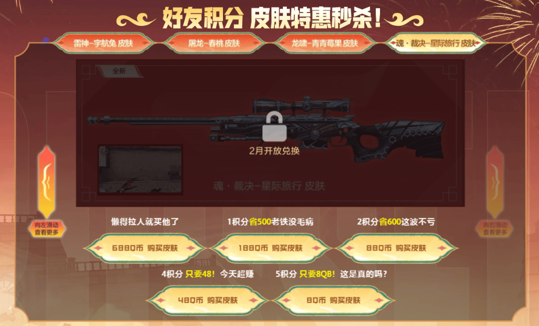 参与方法:CFer消耗好友积分即可兑换特惠秒杀皮肤机会,原价688Q币的皮肤最低8Q币即可购得。
