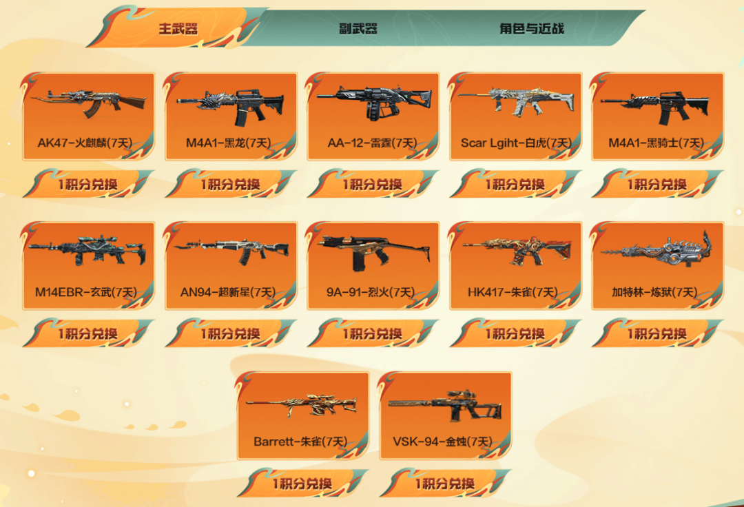 参与方法▼•:回归玩家每日签到积累回归积分后,即可在周末兑换▷“主武器”、“副武器◁■-”及“角色与近战”奖池内的期限版热门武器。