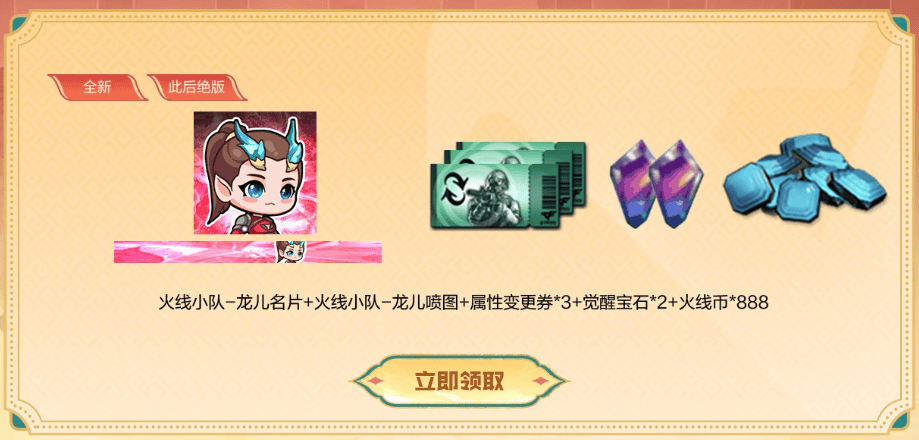 核心道具奖励:火线小队-龙儿名片●◇○、火线小队-龙儿喷图、属性变更券*3、觉醒宝石*2○▲△、火线