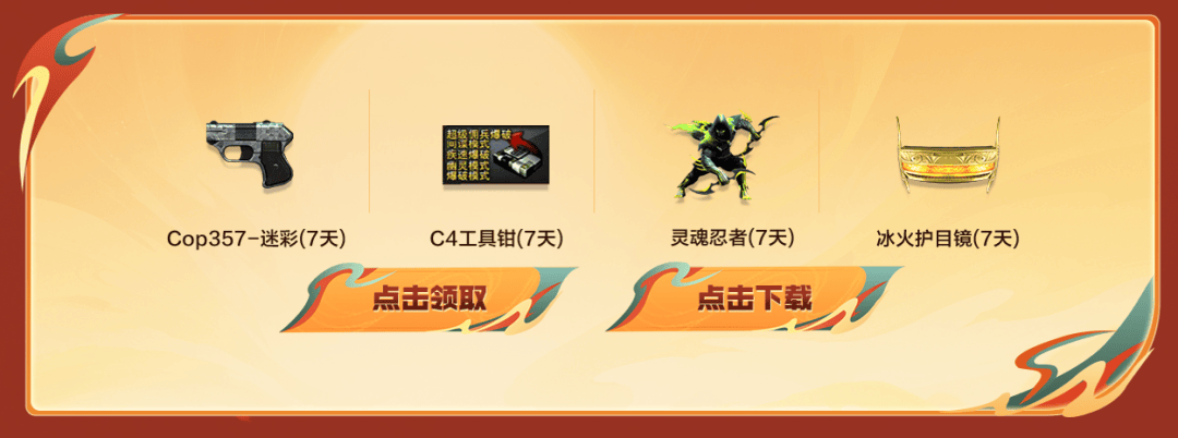 核心道具奖励:COP357-迷彩(7天)、C4工具钳(7天)、灵魂忍者(7天)◆▼□、冰火护目镜(7天)