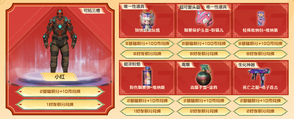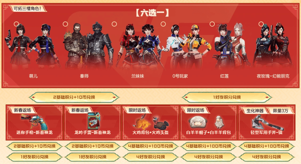 萌儿▼、秦师▽-▪、兰妹妹△、0号玩家、红莲、夜玫瑰(6选1)●…、迷你手枪-新春神龙◇、龙吟手雷-新春神龙、火鸡背包+火鸡头盔、白羊羊帽子+白羊羊背包、轻型斧-镜(以上2月开放兑换)