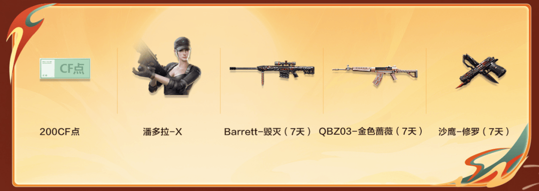 其他道具奖励:Barrett-毁灭(7天)、QBZ03-金色蔷薇(7天)、沙鹰-修罗(7天)
