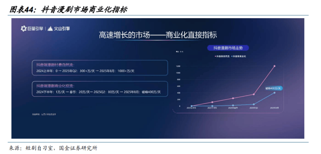 多模态技术红利释放▲•▲,动态漫已预定“爆款”。1)随着2025年多模态大模型技术路径的收敛与突破◇□◁,动态漫的视觉表现力实现了质的飞跃。在需求侧•◁-,其叙事节奏紧凑、情绪密度高,精准整合了当下用户在碎片化时间内的娱乐偏好;在供给侧•,相较于传统动画或真人短剧,AI赋能下的动态漫制作周期大幅缩短,具备低成本、批量化产出的显著优势◇。技术跃升叠加供需适配▪,正推动该渠道加速从边缘走向主流。2)根据巨量引擎与火山引擎统计★◆•,2025上半年,漫剧市场商业化高速增长▽•,抖音端漫剧付费自然流:从2024上半年的0,一路跑到2025年二季度的300+万/天、2025年8月的1000+万/天;抖音端漫剧商业化提流◁:从2024下半年的1万/天,逐步上涨至春节的20万/天、2025年二季度的80万/天☆◇■,并在2025年8月破峰,达到400万/天。