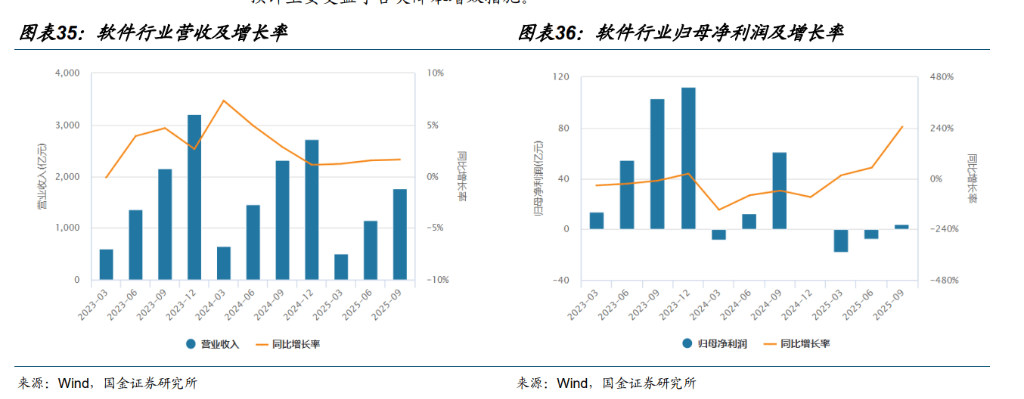 计算机行业基本面已于 2025H2 见底回升,具备反弹条件。根据 Wind 软件指数(882250△☆-.WI)★●☆,可以看到,软件行业营收已于 2025H2 见底回升。其中 2025Q3□,行业营业收入 1765▪■◇.19 亿元,同比增长 1.61%◆。收入端全年维稳、缓慢修复;归母净利润 3◆▼.77 亿元,同比增长 244.56%,预计主要受益于各类降本增效措施。
