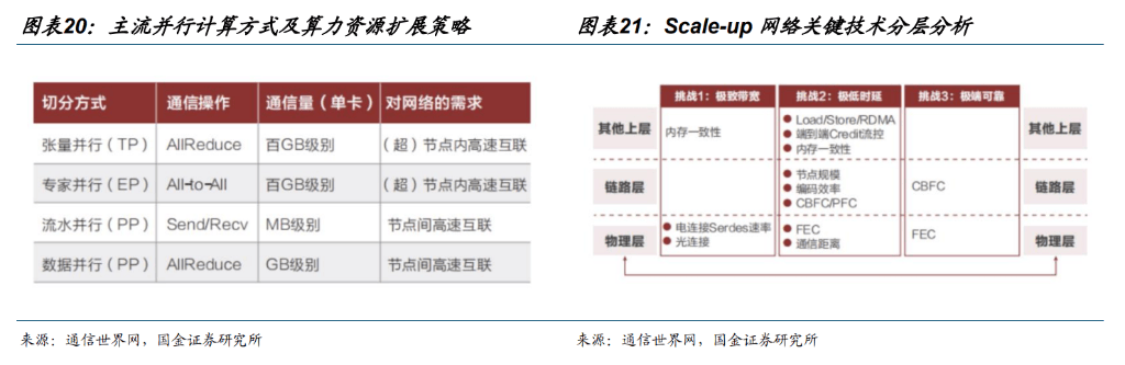 Scale-up 与 Scale Out 持续拓展。大模型需要采用多机多卡集群的方式进行训练,主流的并行训练方式有数据并行●、模型并行(张量并行、流水线并行)★=■、专家并行等☆•。张量并行和专家并行的并行计算方式▪,每次迭代数据量达几百 GB,GPU 互联需要高带宽和极低时延•••,以压缩 GPU 之间的通信开销成本。随着大模型参数规模指数级增长-▪-,单卡有效算力难以应对超大规模的算力需求,高带宽、低延迟的中间互连技术成为关键竞争要素,对 GPU 集群互连拓扑结构也提出了更高要求,驱动了纵向扩展(Scale-up)与横向扩展(Scale-out)网络架构的技术演进。
