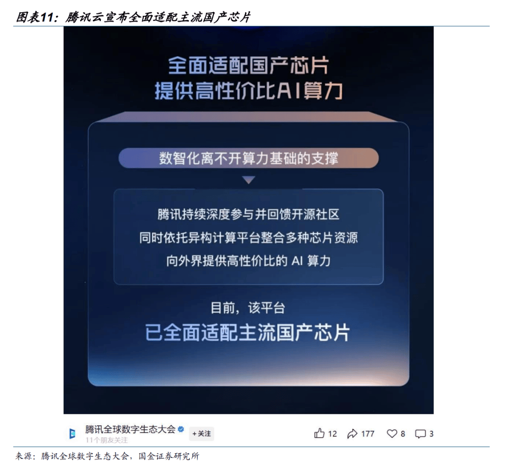 CSP 厂商加速造配,助力国产芯片生态建设。英伟达的 X86 生态、英伟达的 CUDA 生态之所以难以撼动,核心在于形成了“芯片-软件-应用■=◇”的闭环▽。而当前国产阵营中,华为野腾◆、阿里早头等,壁切科技等芯片厂商各有技术路线,生态分散问题显著。腾讯集团高级执行副总裁汤道生在交流中坦言,不同参数规模的 AI 模型需要适配不同芯片配置=,当前只能通过与多家厂商合作实现场景覆盖。百度▼、阿里等企业加速造配国产芯片◁,推动“芯片-模型-应用”闭环形成。