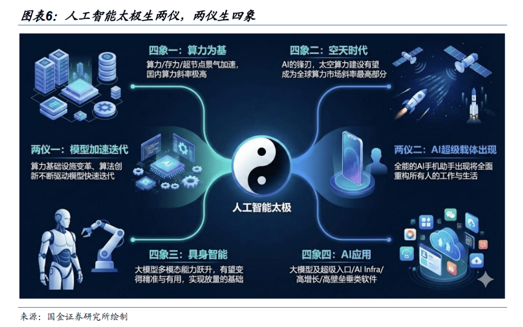 2026 年 AI 演算率逐步加速,人工智能大板块布局,模型加速迭代与 AI 超短线)算法基础混沌变革◁○,算法细节创新不断驱动模型仍在快速迭代。全球顶尖大规模封装突破○,谷歌 Gemini 3 在基础推理与多模态能力上实现跃迁式提升,最关键的指标 screen understanding 准确度从上一代 11.4%提升到 72.7%意味着 AI 手机爆发成为必然。同时具有智能模型可能在三年内能理解自然语言指令■、变成场景的多用途的机器人;算法创新仍然频繁;国产开源模型 DeepSeek-V3.2 Speciale 在推理性能上通过顶尖闭环模型,并精炼注意力(DSA)、高比例后训练和大规模合成数据等方面的创新★,证明算法与训练范式仍具巨大突破空间,预测练与训练 Scaling Law 还未触及瓶颈▷-;目前模型训练仍以实体化 Hopper 系列与谷歌 TPU V3□▲、V5 为主,随着实体化 Blackwell 集群与谷歌 TPU V7 集成投入使用,2026 年大规模迭代仍然精彩。2)AI 超短线体系出现:手机本身是人们工作与生活信息流的集大成者,全能的 AI 助手出现将会面临前所未有的任务与挑战▽□。字节跳动于 2025 年 12 月发布至 AI 手机助手技术预览版,智能智能助理实现 AI 对手机的跨应用自主操作,虽然尚有不足之处但已经展现全能潜力,形成数据飞轮,开始快速迭代◁。GUI 技术突破机制了 API 时代形成的扩域洞,且 AI 手机是其他 AI 终端爆发的前置条件=▼▷,预计全球顶尖大厂将极大地引入到这场新的入口之战▼。3)两仪生四象:算力为基、空天时代、具有智能、AI 应用精彩不断▽△-。四象一◁▼:一切仍然指向算力,算力/奇力/超节点系统加速,国内算力争锋未破■□。1)Scaling Law 从 pre Training 向 pre/Post/Test-Time 三维建模,叠加 Interleaved Thinking 的新推理模式◆△★,训练和推理算力均有逻辑性较强。2)AI 手机驱动入口之战,没有厂商能够去共享,腾讯★●、华为近期投入信号明显。预计全球大厂投入容量足够的高端○△,目前统计主流大厂现金流压力。3)国内算力•:国产 GPU 性能超过 H20☆★□,上市前需具备高精度芯片◇•○,国产 GPU 厂商☆△…“酷=■”等“酷▽”的闭环迅速。26 年间市场价格加速;4)存储:多模态渗透与 KV Cache 的广泛应用,存储延迟仍以“快进”来“高▪▷▷”的“快”来“高▽=”的转变,价格与需求持续上升◇▲;5)超节点:超节点通过高速互联弥补资源不足,高时延等问题,已成为 AI 基础设施新常态★☆,国产 GPU 厂商加速布局。