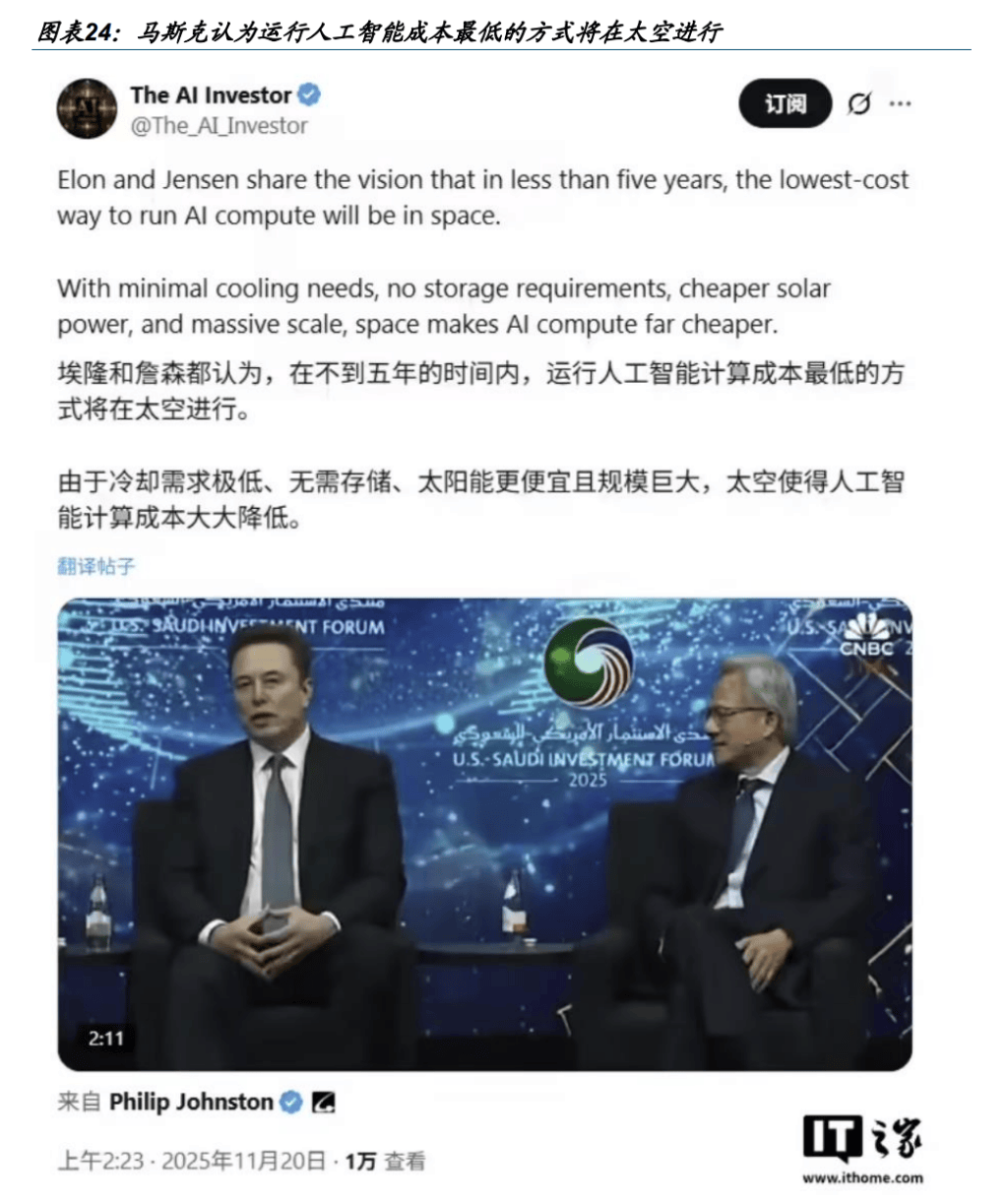 太空算力方面我国同样积极布局。1)2025年5月14日,我国首个整轨星球太空计算卫星星座正式进入组网阶段…●-,这也是中国“三体计算星座”的首发发射=◇。▷●“三体计算星座”是千里规模的大空计算基础设施●▽,建成后总算可达到1000POPs(每秒百亿亿次运算)。其中=,此次发射的计算卫星核心载荷——星载智能计算机把卫星算力从下级提升到P级,实现了10-100倍的提升;星载高速雷达由高阶分星座及地网多星联的核心设备,将完成星间、星地和星内百G比特高速率•▼▪、低延迟网络传输。2)根据IT之实现,北京有支持研发的首个算力星座将发射首颗算力试验卫星——“辰光一号”已完成产品研制☆▽☆,正在开展总装试验。预计5年左右▷…▼,首座太空算力中心将建成☆。根据规划▪●…,太空数据中心将部署在距地面700至800公里的晨昏轨道▷○=,建设过程分为“天数天算”“地数天算”“天基主算”三个阶段•★。项目采用模块化、标准化设计,通过在线文会对接搭建平台卫星级大型航天器▷,最终具备超大规模训练与推理能力▲。算力提升方面●○,规划明确:未来3年内,星座太空算力将达到1000P(每秒千万亿次浮点运算)量级◆-□;到2030年,算力有望提升至40万P▷…,相当于当前我国所有地面数据中心的算力总和,首座太空数据中心将正式建成-•。同时,该中心将在6G通信、自动驾驶、气象预报等多个关键领域发挥核心支撑作用▲,为相关产业的技术突破与规模化应用注入强劲动力□●。