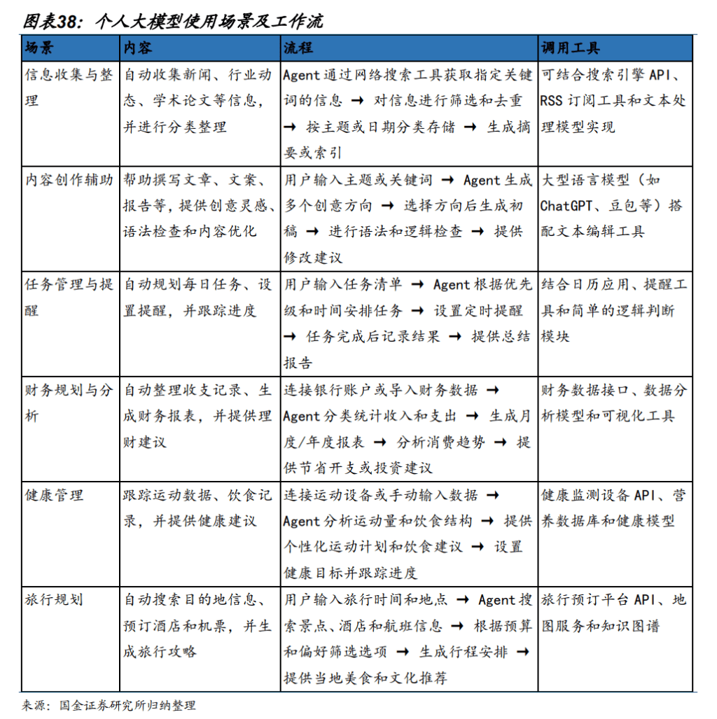 在使用大模型过程中▷,用户可将其与个人知识库及工作流深度结合▲●…。1)大模型使用场景远不止对话及搜索▼,用户可利用大模型为自己设计和搭建的自动化、智能化工作流程,旨在提高效率=★、简化任务实现特定目标●…-。2)根据日常的工作生活○,工作流可包括信息收集与整理、内容创作与辅助、任务管理与提醒、财务规划与分析、健康管理、旅行规划等。相比通用 AI,自定义 Agent 可以使用者个人的知识库及工作流深度结合,通过多次使用与反馈,Agent 的个性化及效益水平可持续提升。