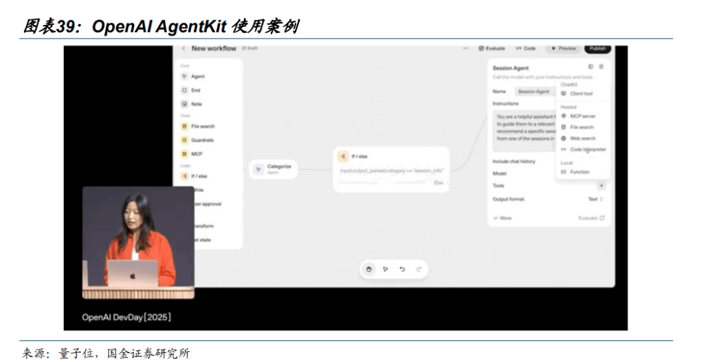 头部基于厂商已发布各类开发工具=▼,助力基模更方便、更深入地部署。1)OpenAI:2025年10月▪▼◇,OpenAI开发者自2025召开◁□●,发布AgentKit工具包,包含诸多模块◇=■,可以帮助开发者更高效设计工作流-◁★。例如通过Agent Builder模块▪☆★,开发者无需从代码开始○,只需添加并设置一系列节点即可可可视化直观的方式快速构建Agent▪。OpenAI研究员现场演示,在8分钟内用AgentKit为其开发者日常访问站构建Agent••。2)腾讯:微信最终会推出一个AI智能体,让用户在微信内部就可利用AI完成多项任务•=▷,能够理解用户的需求、意图和兴趣。他表示,微信拥有强大的通信和社交生态系统,还有购物支付等场景,几乎是用户的理想助手。但刘汉平也认为,目前这项愿景还处于“非常早期的阶段”;目前•●•,微信正在多地引入元宝能力,包括用AI来增强搜索等。同时…▲■,腾讯也在开发垂直领域的智能体能力,这些能力未来会逐步开放■、整合,从而打造出微信智能体的理想蓝图=。