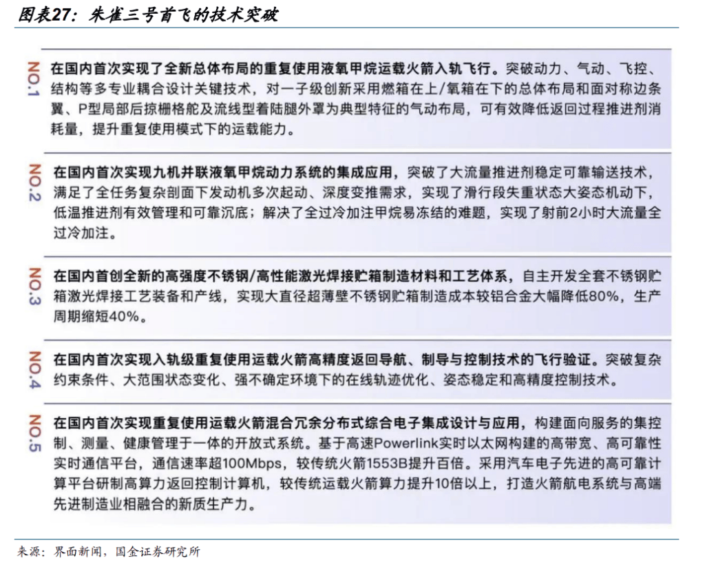 我国可回收火箭技术突破正在临近,“国家队”与民众积极良性竞争。1)2025 年 12 月 3 日,朱雀三号遥—运载火箭在东风商业航天创新试验区发射升空,被程序完成了飞行任务,火箭二级进入预定轨道。与此同时,本次任务开展了一子级垂直回收技术的飞行验证。根据飞行测量数据,火箭一子级在陆上形成大片出现异常,未实现定向收场并的装备后,残骸者由于回收场并边缘。2)12 月 23 日,长征十二号甲遥—运载火箭在东风商业航天创新试验区发射升空,运载火箭二子级进入预定轨道,一子级未能成功回收,飞行试验任务获得基本成功。本次任务虽未实现预定的火箭一级回收目标•,但是获取了火箭真实飞行状态下的关键工程数据,为后续发射■●、子级可靠回收奠定了重要基础。根据贝壳财经,首次发射或实现回收没有先例--•。猎鹰 9 号从首发到成功回收历经 5 年◇◆□,经历了 20 余次试错爆炸▷▲,新枪代火箭历经发动机爆炸、储箱爆裂等多重挫折才实现入轨。我们认为,在当前政策支持下叠加国营企业与民众积极竞争,我国火箭发射瓶颈将得到快速突破★◆◁。