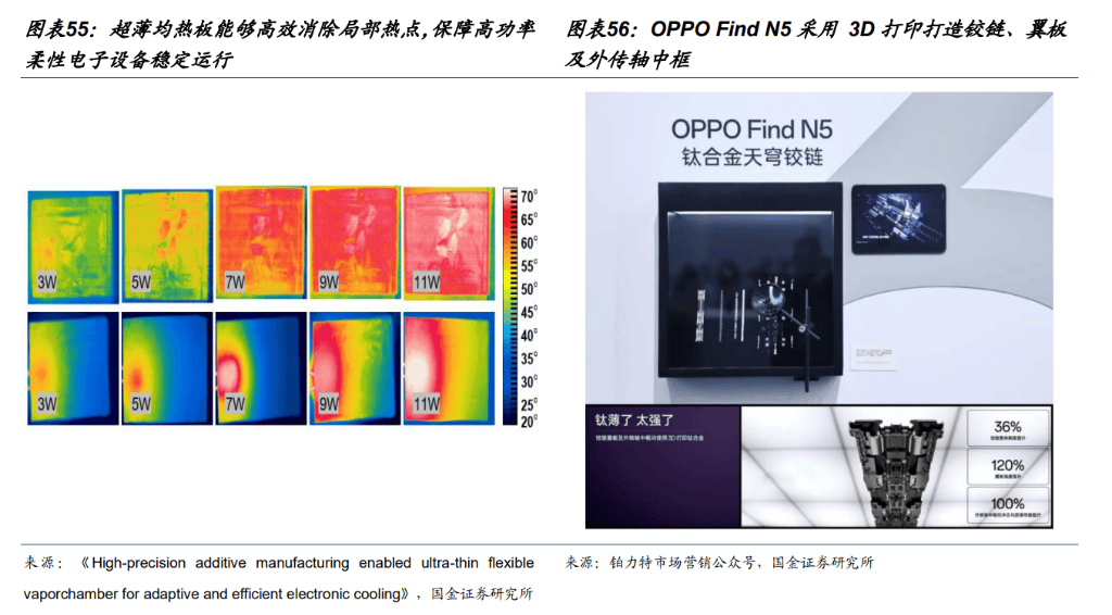 端侧AI时代,3D打印能增强热管理与定制化,随着AI大规模在手机及AIPC等移动端落地,芯片瞬时高算力引发的热流密度激增与设备极板轻薄化的空间限制形成矛盾,3D打印技术能够制造出传统冲压或触动工艺无法实现的□=,适应异形软管空间的超薄均热板■▪,通过构建复杂的内部三维毛细结构大幅提升被动散热效率,保障端侧AI的稳定运行=★●;另一方面,针对折叠屏子机较轻柔性结构件的高强度合金结构的趋势•=■,3D打印有较大规模了钛合金材料传统CNC加工良率低■、刀具磨损大且难以切削复杂内腔的难题,实现了较轻量钢带部件的一体化成型与拓扑减重,在满足数十万次折叠寿命的同时也为电池释放了宝贵的维生空间▪●,成为高端3C产品迈向轻量化与耐用性平衡的必选方案•…。