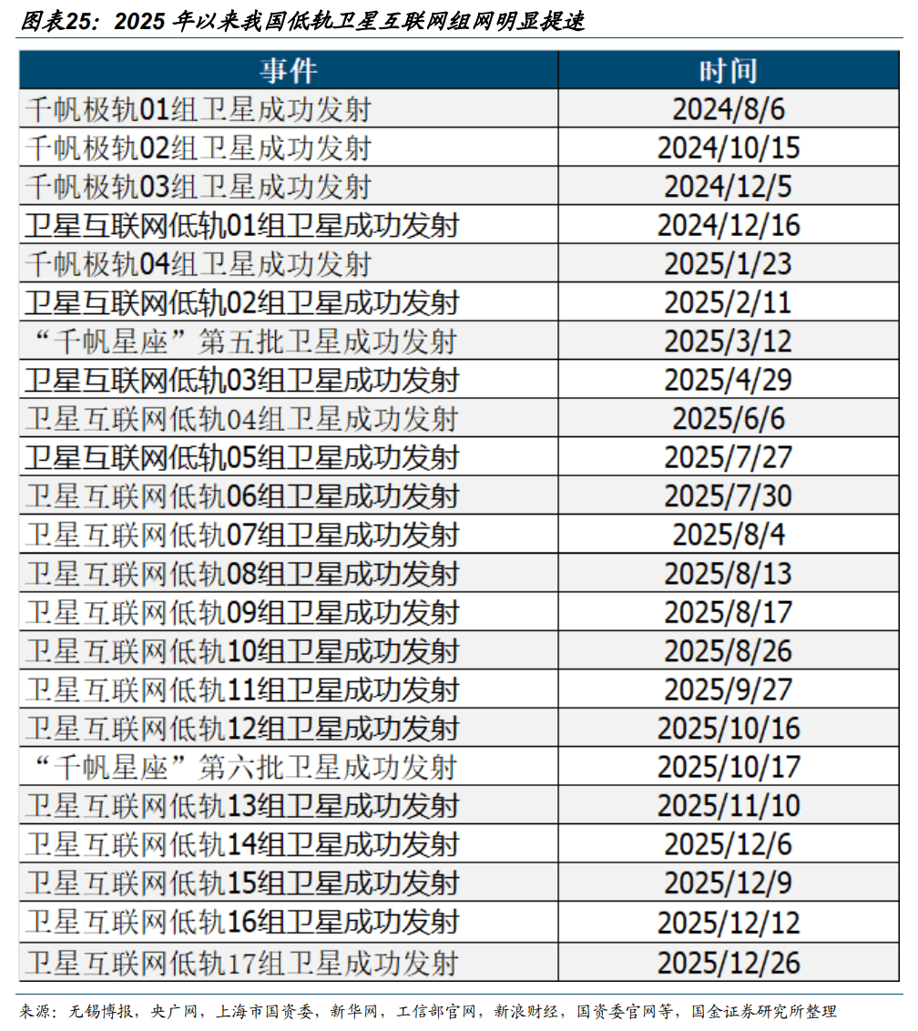 2025年以来我国低轨卫星组网速度明显提速,后续有望进一步加快组网节奏。千帆星座首次组网于2024年8月开始,GW星座于2024年底开始组网■,通过统计发现2025年我国两大星座组网显著加速,截至2025年12月26日=▪,GW星座2025年合计成功发射16组低轨卫星。我们认为,由于轨道资源稀缺△■○,后续我国卫星组网速度有望进一步加速。