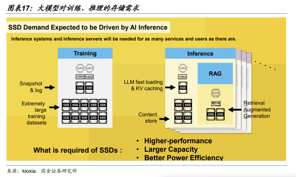 AI 大模型推理拉动存储需求快速增长=▷○。训练侧○☆◇,SSD 不仅负责储存模型参数,包含不断更新的权重和偏差,而且可以创建检查点(check point),以定期保存 AI 模型训练进度,即使训练中断也能从特定点恢复;推理侧▲,主要包括三个方面:1)LLM fast loading & KV caching•: 快速装载模型相关内容并支持 KV 缓存=□…,加速推理响应-■;2)Content store: 推理侧需要内容存储作为在线供给(可理解为面向推理的内容/数据存储);3)RAG●◆☆: 检索增强生成“检索”引入推理闭环,推理链路对存储访问更敏感。存储芯片市场正经历一场由 AI 驱动的◆-、前所未有的全面快贷与涨价潮。进入第四季度非但没有趋缓,反而有进一步加剧的迹象。