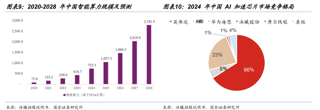 智算中心持续扩容,国产替代加速•=。根据 IDC 数据,2020 年中国智能算力规模为 75.0 EFLOPS=☆,到 2028 年预计将达到 2▷○◆,781.9 EFLOPS▪◁,预计 2020-2028 年复合增长率达到 57.1%●。随着地缘政治紧张局势推动中国企业寻求本地替代方案,以及国产芯片技术的稳步提升,国内云服务提供商正在加速构建并构架核心(将不同类型的芯片结合使用▼,如 CPU-、GPU、国内替代芯片)。例如▲-•,腾讯云已将其异构计算平台全面兼容所有主流国产芯片,以满足内部开发和客户对 AI 算力的需求▲…▷。根据 Bernstein Research,2024 年中国 AI 加速芯片市场中□◇,英伟达■、AMD 市场份额分别为 66%、5%,合计占比达 71%。但受益于国产替代趋势及供应链安全需求▽◇,国内计算芯片公司正迅速提升。其中,华为海思/沐曦/摩尔市场份额已分别达到 23%/1%/1%。