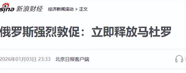俄罗斯强烈敦促:立即释放马杜罗 2026年01月03日23:33北京日报客户端