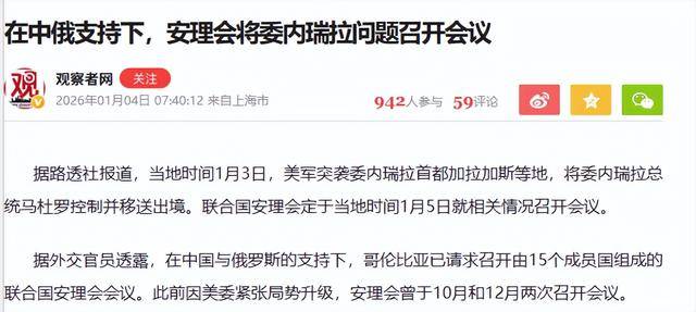 在中俄支持下,安理会将委内瑞拉问题召开会议 观察者网2026年01月04日07:40:12