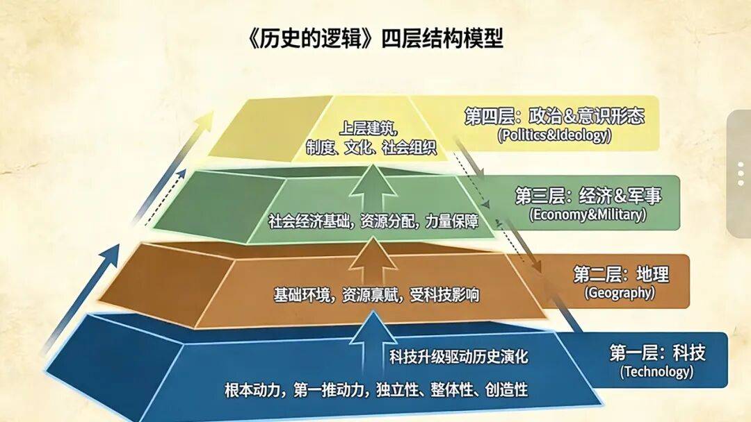 这里就要提到《历史的逻辑》这本书▲,它超越了《天道》的文化视角▲,构建了一个以科技为第一推动力的“四层立体认知模型•-…”回答了《天道》当年没触及的问题☆•▼:为什么是芯片、AI这些科技,而不是文化理念,成了今天竞争的核心?