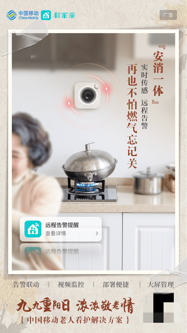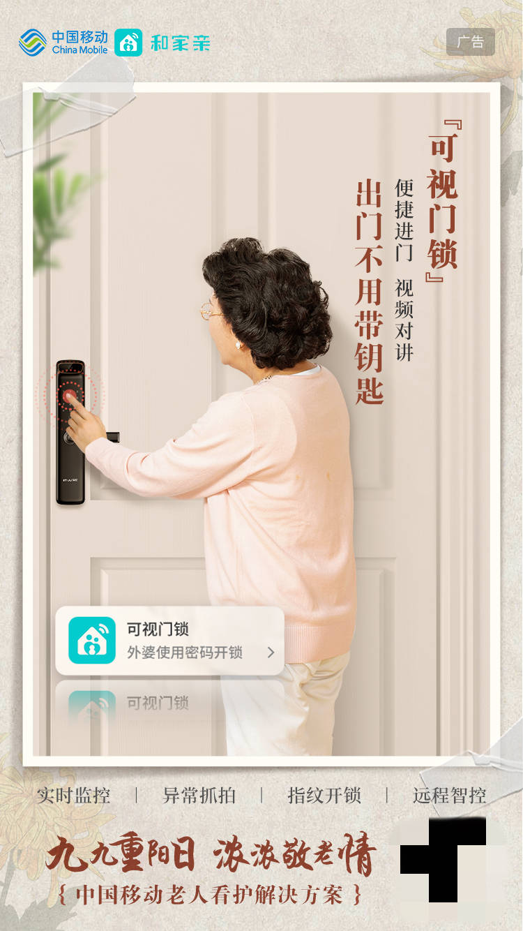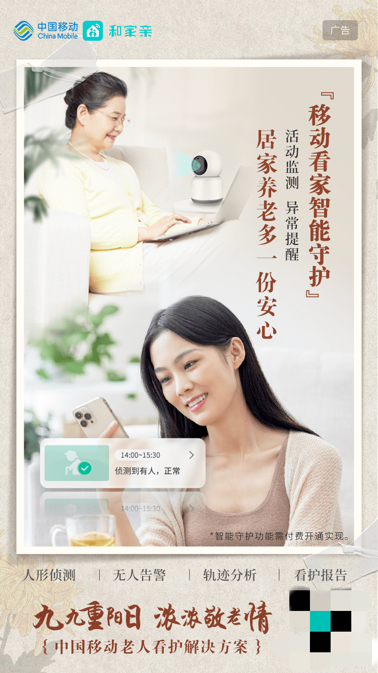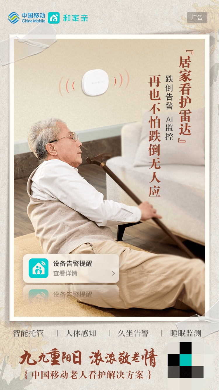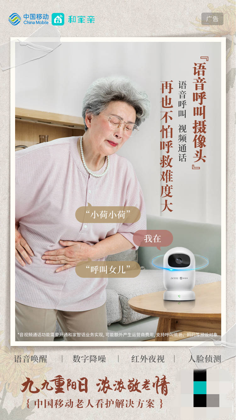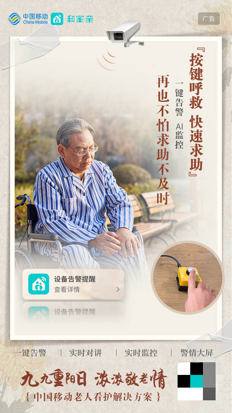 九九重阳日=■,浓浓敬老情!敬老爱老,关注老年人的健康与安全尤为重要▷△★。在重阳节来临之际=▽,中移智家重点推出老人看护解决方案,为身边的老人带来更多的关爱与陪伴●,让老年人的生活更加智能化◇、便捷化▼★-,让科技为老年人的健康与幸福保驾护航…△!