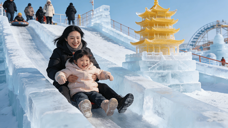 午后的冰雪大世界之旅彻底点燃了热情。多亏旅行社提前预订的家庭臻享票,我们不仅省去了抢票烦恼,还解锁了快速通道和休息室权益,1.2 米以下的小女儿更是直接享受免票优惠。入园后导游立刻带我们直奔核心区域,原来今年园区足足有近百条滑道,光亲子友好型就占了三十多条。西侧的 12 条缓坡滑道刚好适合孩子,我陪着小女儿下滑时,能清晰看到旁边黄鹤楼造型的冰雕◆★,滑行结束转身就能打卡拍照,真正实现 “玩中赏景◆…”◇=。大儿子则拉着先生挑战了八爪鱼小滑梯,从不同方向同步滑下的互动设计,让父子俩笑声不断▽○☆。