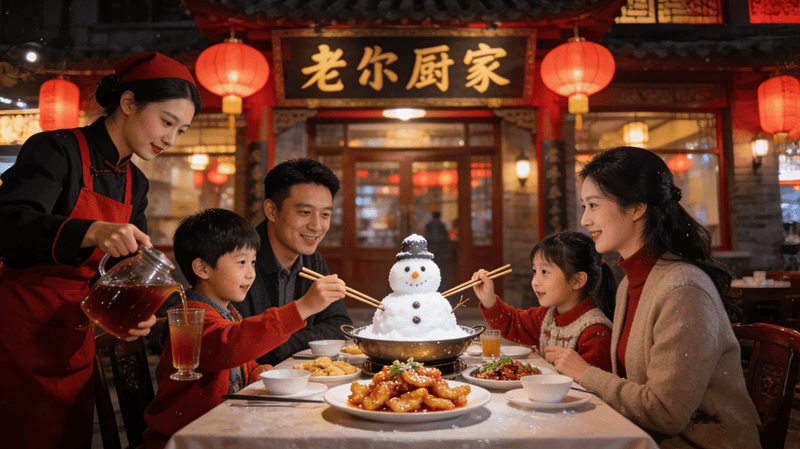 放下行李已是午后,按照行程的 “轻量开局□▼” 设计,我们漫步在面包石铺就的中央大街。孩子们踮脚够到马迭尔冰棍的小份装◁,在零下二十度的街头舔得津津有味;晚餐的东北亲子菜馆里,雪人造型的锅包肉、迷你份的小鸡炖蘑菇征服了全家味蕾,店内的儿童游乐区更让我和先生得以安心用餐。这一天没有匆忙的打卡,却让冰城的暖意渗透进每一个细节▲。