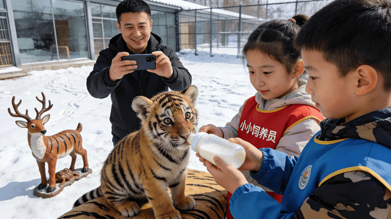 第三天的横道河子之行让旅程充满野趣•★。三小时的雪地大巴上,导游不仅讲解虎类科普▲,还准备了绘本和零食安抚孩子●…。在东北虎林园◇,我们参与了 “小小饲养员” 活动○-,看着孩子们小心翼翼地给幼虎调奶粉,观摩无人机投喂的壮观场景◆■,这种沉浸式科普远比书本生动得多▽●○。下午逛俄式老街时,孩子们坐在雪地爬犁上飞驰,积雪飞溅的声音与笑声交织在一起,成了最动听的冬日旋律。