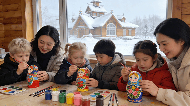 伏尔加庄园的第四天则充满文艺气息。在导游的带领下,我们体验了 DIY 俄罗斯套娃和列巴制作=☆,孩子们把亲手绘制的套娃塞进背包,说要送给幼儿园的小伙伴。城堡雪圈项目里,我和小女儿组队下滑•,先生在一旁拍照记录,而同行的老人则在暖房里喝着热饮休息,全龄适配的安排让每个人都各得其乐○。