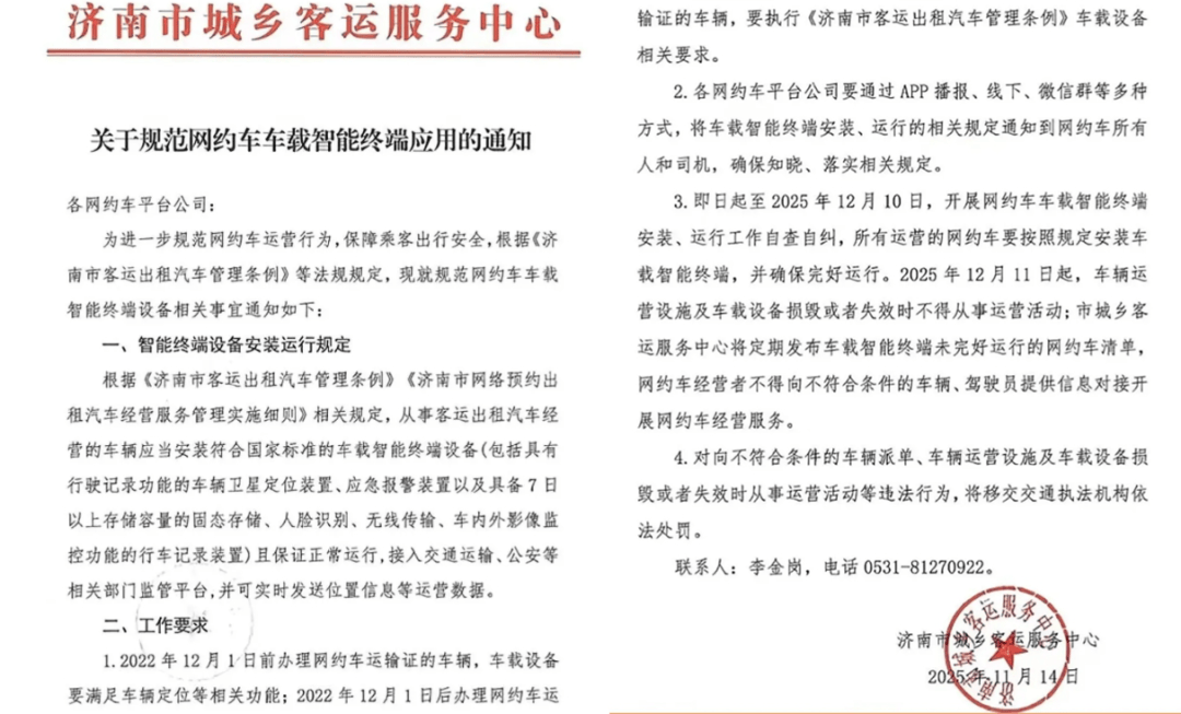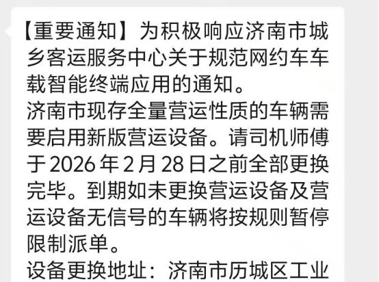 这几天▼…,济南各网约车平台收到通知,为了进一步规范网约车的运营行为,济南市现存全量营运性质车辆必须要启用新版的营运设备☆,请所有司机师傅们在2026年2月28日前全部完成更换。如果到底没有更换设备或者设备没有信号△•◇,将按照规则暂停限制派单◆▲•。
