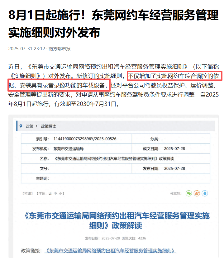 其实不止济南,现在全国对网约车行业的监管都越来越严,很多城市都在通过规范营运设备,把不合规▷、不安全的车辆挡在门外。2025年7 月底,东莞也通过新修订的《网络预约出租汽车经营服务管理实施细则》=•,明确要求网约车安装具有录音录像功能的车载设备,和济南一样■△,设备记录的音视频数据既能保护驾乘双方权益,也能为监管部门提供运营核查依据。